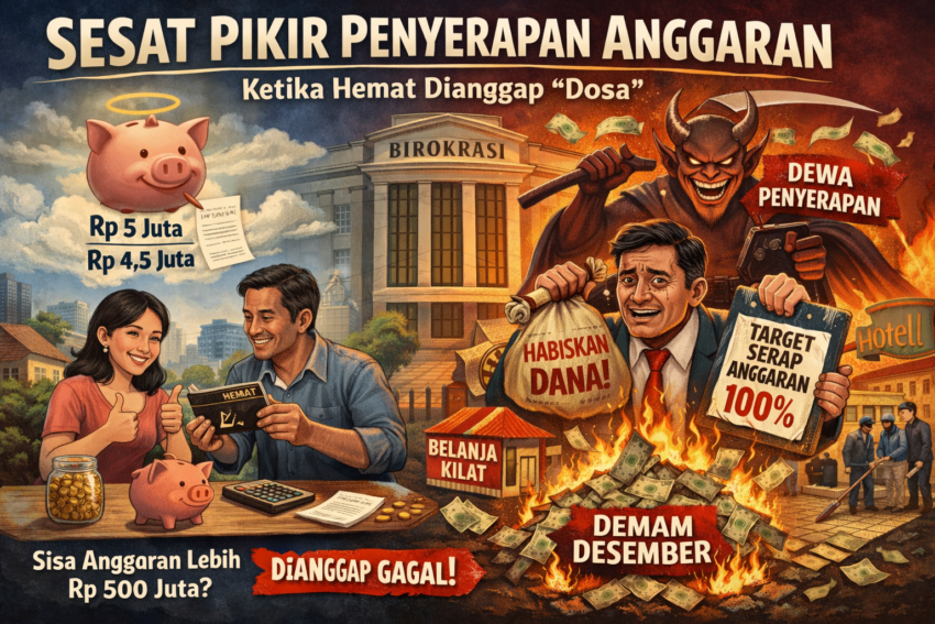 Dalam logika rumah tangga atau bisnis yang waras, menyisakan uang belanja adalah prestasi. Jika Anda diberi bekal Rp5 juta dan bisa hidup layak dengan Rp4,5 juta, Anda cerdas. Anda efisien. Namun, logika waras ini mati seketika saat melangkah masuk ke gerbang birokrasi keuangan negara. Di sana, penghematan adalah anomali yang harus dihukum. Kita hidup dalam…